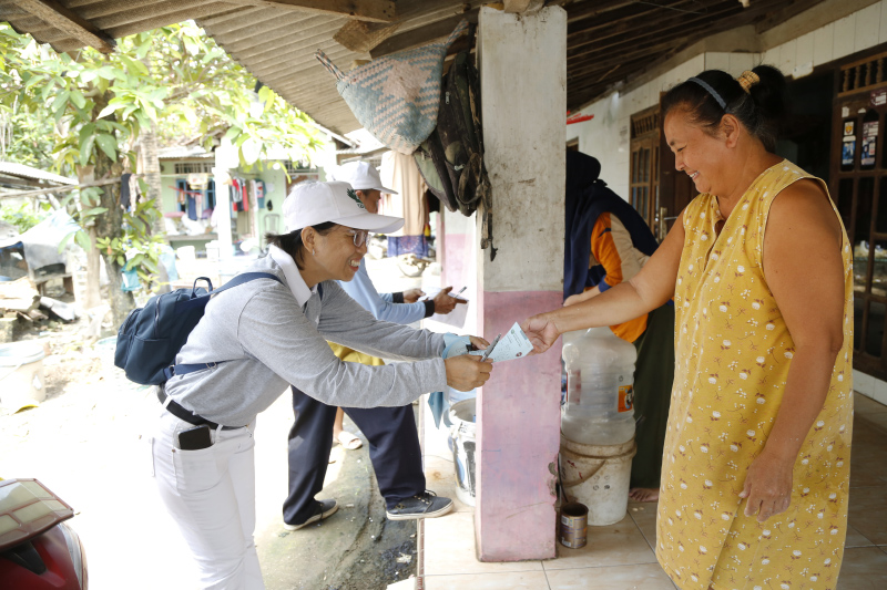 Suwarni Vimaladewi menyerahkan kupon kepada warga Desa Sambiroto, Kecamatan Tayu. Survei dilakukan agar bantuan yang diberikan bisa tepat sasaran.