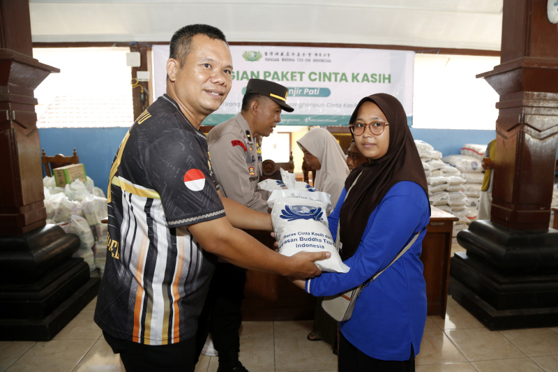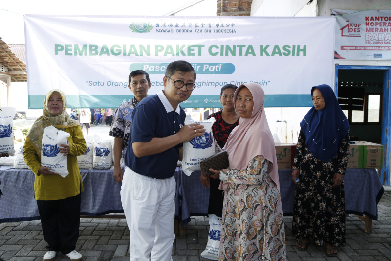 Menyambut hari raya Idulfitri 1447 H, relawan Tzu Chi Pati menyerahkan 5.249 paket cinta kasih untuk warga di dua kecamatan yaitu Kecamatan Tayu dan Kecamatan Gabus, Pati, Jawa Tengah pada 11-14 Maret 2026. Setiap paket berisi beras 5 kg dan 20 bungkus mi instan DAAI. Bantuan ini juga sebagai upaya untuk meringankan beban warga pascabanjir Januari lalu.