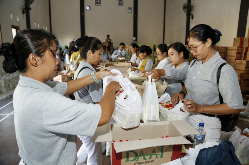 Relawan Tzu Chi Pati bergotong royong mengemas mi instan untuk dibagikan kepada warga di 11 desa di Kecamatan Gabus, Pati. Total ada 5.249 paket yang dibagikan selama 4 hari ini.