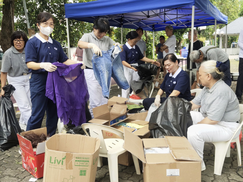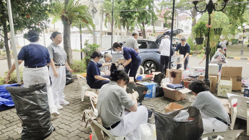 Para relawan Tzu Chi dengan penuh semangat memilah sampah plastik, kardus, dan pakaian bekas dalam kegiatan Pelestarian Lingkungan.