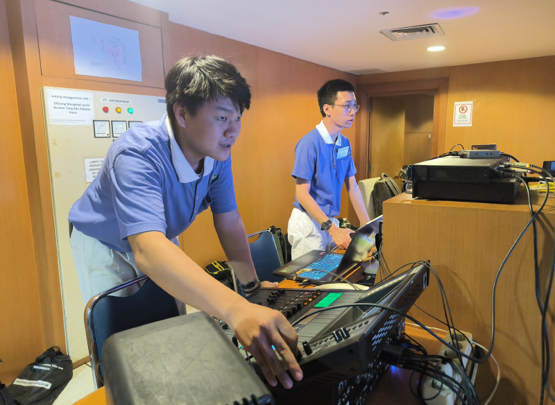 Sebagai Koordinator Sound System, Frederick Liang mengendalikan perangkat audio-visual sambil menjalin komunikasi dengan tim acara demi mendukung suasana persiapan yang optimal.