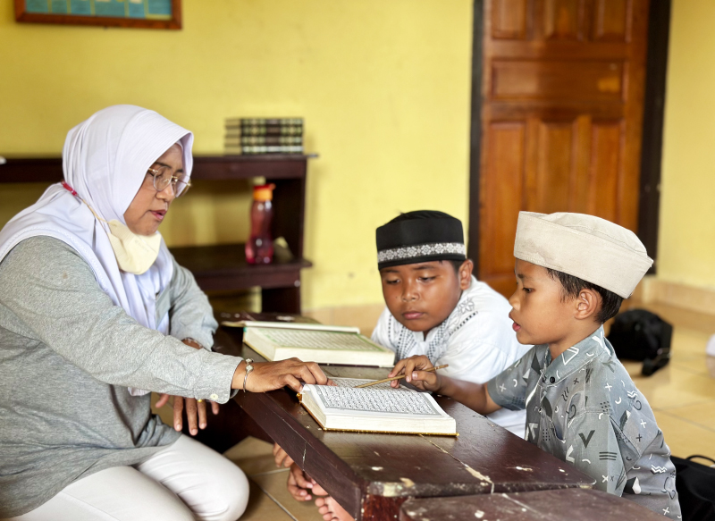 Dengan penuh cinta kasih, Rumiati membaca Al-Quran bersama salah satu santri.