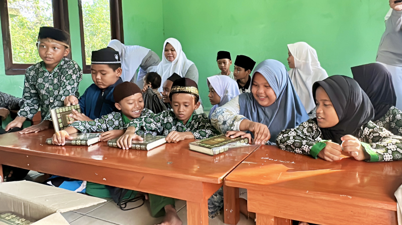 Dengan senyum bahagia, para Santri yang antusias membuka kemasan pembungkus Al-Quran baru pemberian relawan.