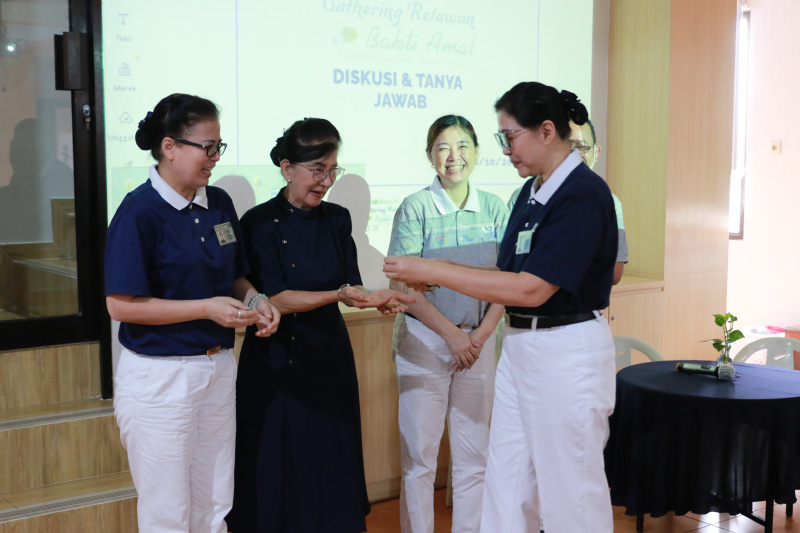 Dalam sesi diskusi, para relawan bertanya tentang berbagai tantangan di lapangan, seperti menghadapi penerima bantuan yang sulit diajak berbenah. Becky menekankan pentingnya memberi teladan dan bimbingan penuh kasih, bukan paksaan. Alam menambahkan, sebelum melakukan kunjungan kasih, relawan harus meninggalkan ego dan emosi agar dapat hadir sepenuhnya dengan empati. “Ketika kita menjadi tempat curhat bagi penerima bantuan, di sanalah cinta kasih bekerja,” ujarnya.