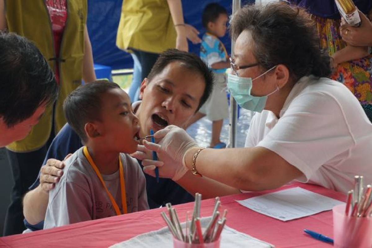 Dokter Edwin dengan ramah dan hati-hati tengah memeriksa gigi pada salah