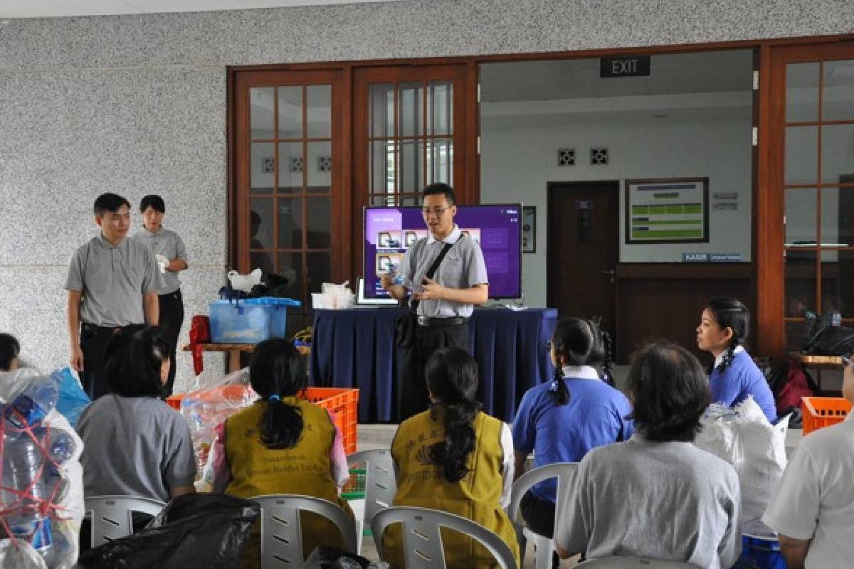 Jurnalis : Galvan (Tzu Chi Bandung), Fotografer : Galvan (Tzu Chi Bandung)Sebelum memilah, Jhonny, relawan Tzu Chi menjelaskan tentang pemisahan label serta ring yang menempel pada botol plastik.