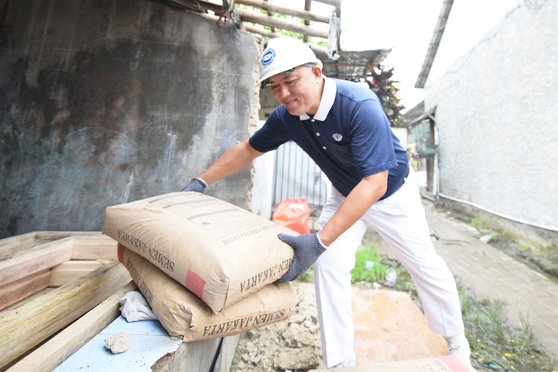Darwin, relawan Tzu Chi memindahkan bahan material semen yang nantinya akan digunakan untuk merenovasi rumah Rustandi.