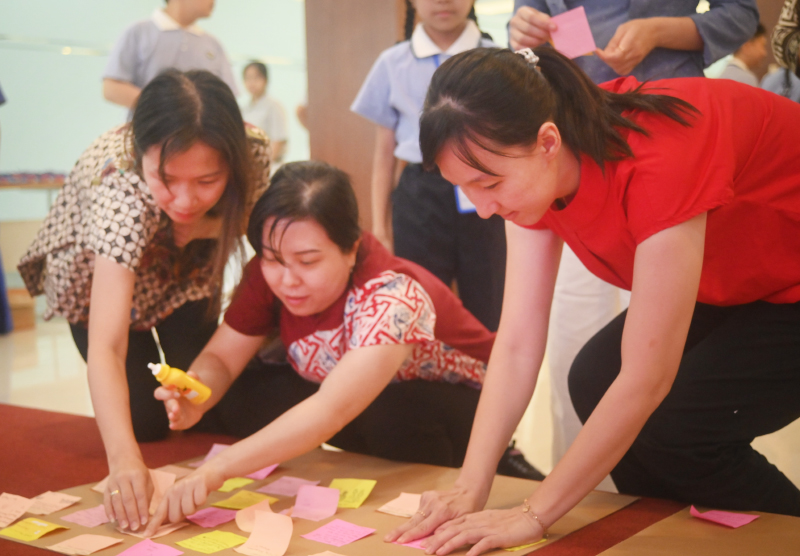 Orang tua dan anak bersama-sama menempelkan harapan serta pesan cinta kasih pada bingkai harapan sebagai simbol kebersamaan dan doa.