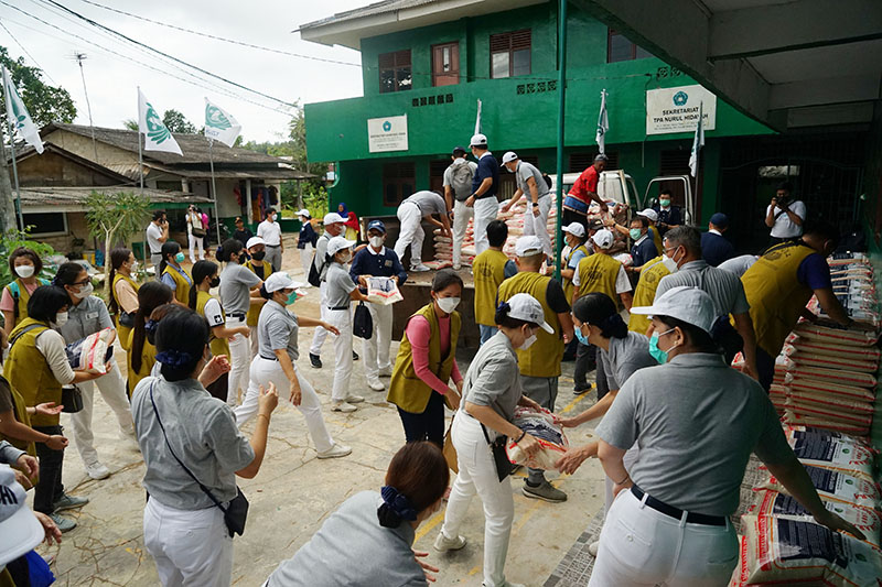 Relawan Tzu Chi bersama PT. Shimano secara simbolis menyerahkan paket beras @10 Kg kepada warga manula dan Ibu-ibu yang membawa balita.