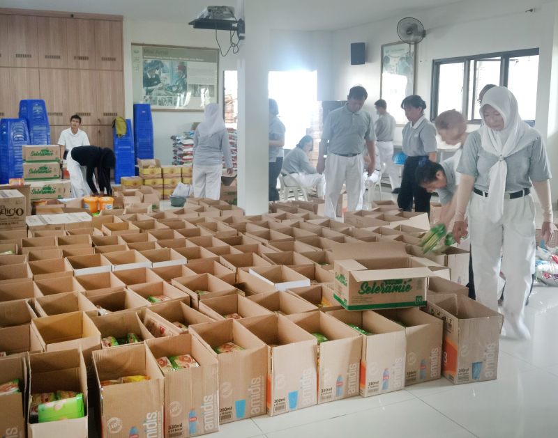 Sebelum dibagikan kepada warga, relawan Tzu Chi bergotong royong mengemas Paket Cinta Kasih Lebaran.