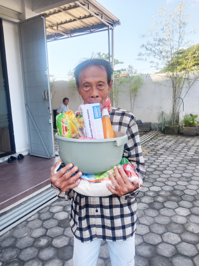 Salah satu penerima manfaat, Bapak Pi, menunjukan isi Paket Cinta Kasih Lebaran yang diterima dari Yayasan Buddha Tzu Chi.