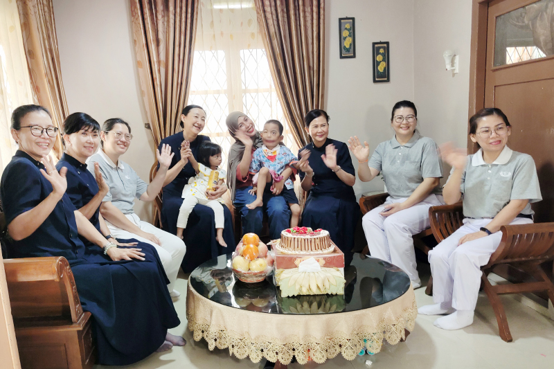 Sebelum pamit pulang, para relawan bersama-sama menyanyikan lagu dan memotong kue untuk Abi. Erni dengan sabar menyuapkan potongan kecil kue kepada Abi, yang masih kesulitan membuka mulut lebar-lebar.