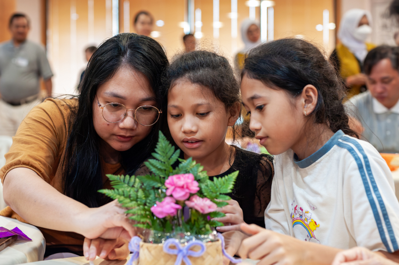 Setelah rangkaian permainan, peserta diajak mengikuti kegiatan merangkai bunga yang dipandu oleh Nancy Shi Jie. Setiap peserta menerima bunga carnation, daun pakis, serta wadah botol bagi anak-anak usia lebih kecil. Carnation dipilih sebagai simbol cinta yang tulus dan penghargaan mendalam, sementara daun pakis melambangkan perjalanan kehidupan yang tumbuh perlahan hingga menjadi kuat dan indah. Ketika dirangkai bersama, keduanya mencerminkan keluarga yang saling menopang dalam keberagaman.