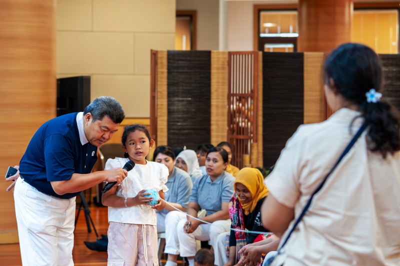 Suasana semakin hangat saat rangkaian permainan dimulai. Dipandu oleh Kasun, permainan pertama bertajuk “Benang Cerita Kasih” mengajak ibu dan anak memegang dua ujung benang, lalu menariknya perlahan sambil mengungkapkan satu hal yang mereka syukuri satu sama lain. Setiap tarikan benang seolah menjadi jembatan yang menyambungkan hati. Ruangan yang semula riuh perlahan hening, dipenuhi rasa syukur dan kehangatan menjelang Hari Ibu.
