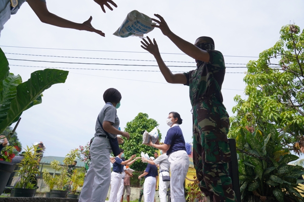 Secara estafet relawan bersama prajurit memindahkan paket bantuan sembako ke gudang logistik Kodam I/Bukit Barisan.