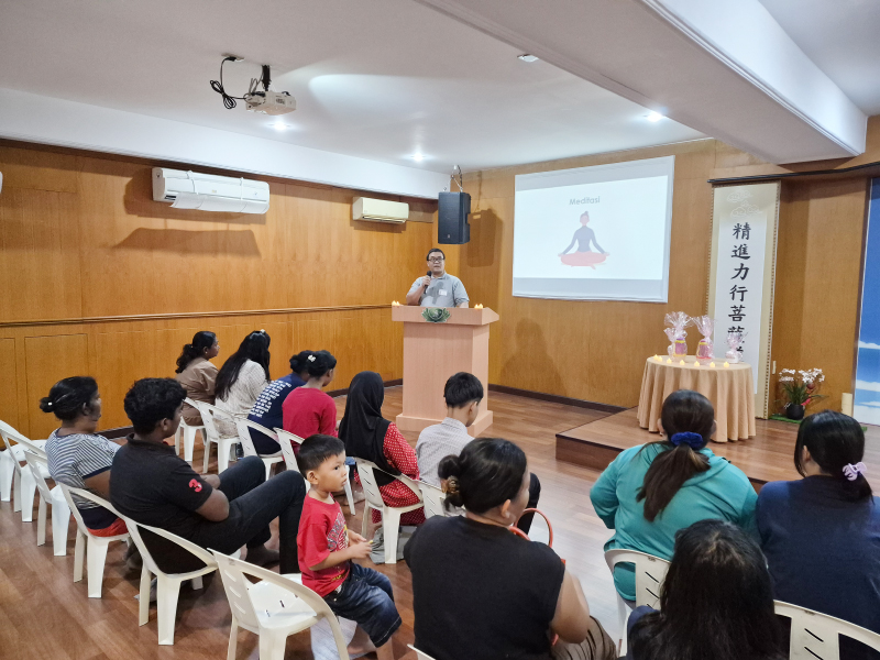 Dalam kegiatan menyambut kepulangan rutin para Gan En Hu (penerima bantuan) dan anak-anak penerima beasiswa Tzu Chi, relawan Tzu Chi, Ronaldo, mengawali acara dengan meditasi yang mengajak seluruh peserta untuk menenangkan diri dan memusatkan pikiran.
