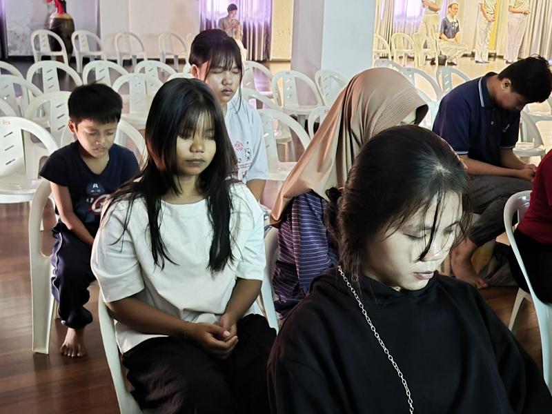 Anak asuh Tzu Chi duduk tenang dengan mata terpejam dalam sesi meditasi, menciptakan suasana hening, damai dan penuh ketenangan.