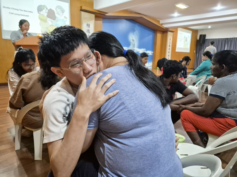 Salah satu anak asuh Tzu Chi, Louis, memeluk ibunya dengan erat penuh kasih sayang dan keharuan.