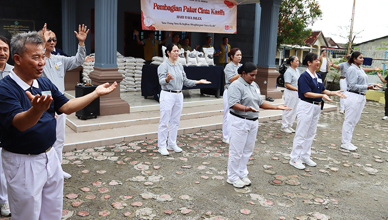 Para relawan mengajak para penerima paket untuk ikut melakukan isyarat tangan dengan lagu satu keluarga.