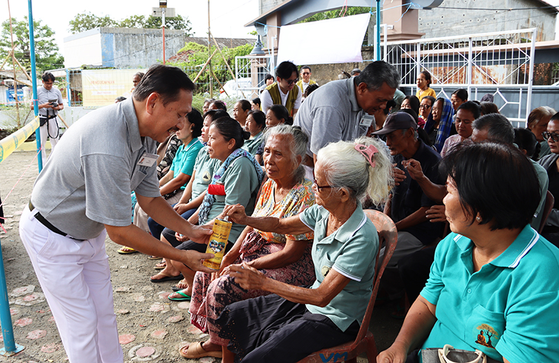 Rudy sebagai koordinator pembagian paket cinta kasih di Vihara Manggala menggalang hati para penerima paket untuk berdana kembali melalui celengan bambu.