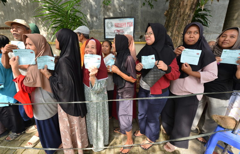 Dengan sabar, warga Kelurahan Tegal Alur mengantre sambil membawa kupon Paket Cinta Kasih Lebaran yang sebelumnya mereka dapatkan dari relawan Tzu Chi.