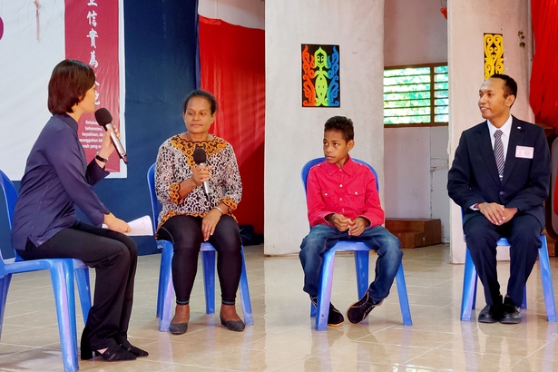 Pemberkahan Akhir Tahun Tzu Chi 2019 di Biak, Papua diisi dengan sharing pasien penerima bantuan yang dipandu oleh relawan, Sarah dan Chandra.