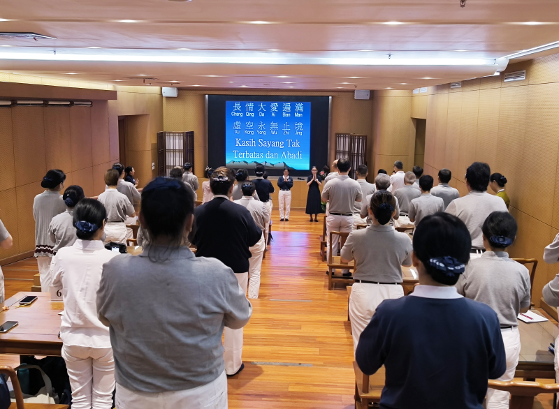 Suasana materi dan pembelajaran shouyu (isyarat tangan) melalui lagu Tiga Tiada yang diikuti peserta Pelatihan Relawan Abu Putih ke-2 sebagai bagian dari penanaman nilai luhur relawan Tzu Chi.