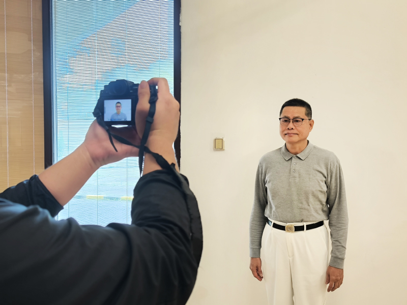 Relawan Tzu Chi, Tim Zhen Shan Mei melakukan pengambilan foto VIS (foto id) kepada Eddy Gunawan Yo, relawan Tzu Chi yang baru saja menerima seragam abu putih.