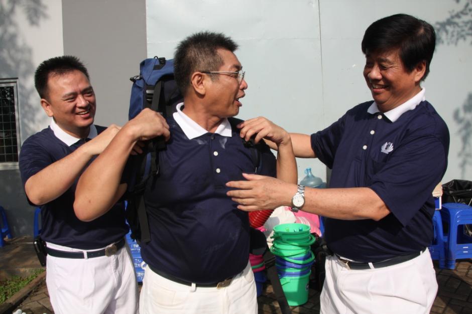 Adi Prasetio (kanan) yang telah memimpin Tim Tanggap Darurat Tzu Chi selama 3 tahun lebih, memasangkan tas ransel ke pundak Joe Riadi, Ketua Tim Tanggap Darurat Tzu Chi yang baru pada saat pelatihan Tim Tanggap Darurat Tzu Chi tanggal 17-18 Juli 2010.