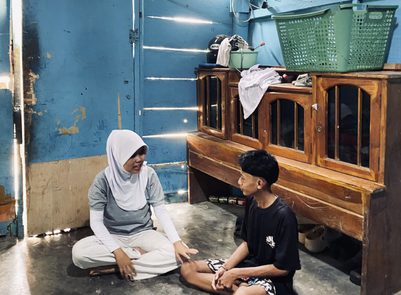 Relawan Tzu Chi Sinar Mas menyemangati Aldo untuk tegar dan kuat menjalani peran sebagai kakak dan orang tua pengganti bagi adik-adiknya.