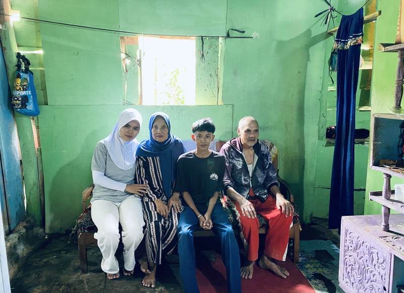 Ada binar bahagia dari kedua matanya saat ia membukakan pintu rumahnya. Ia tersenyum malu sambil menyalami relawan dari komunitas Xie Li Downstream Lampung satu per satu. Aldo (14) saat ini bersekolah di SMP PGRI Sebalang, di desa sebelah.