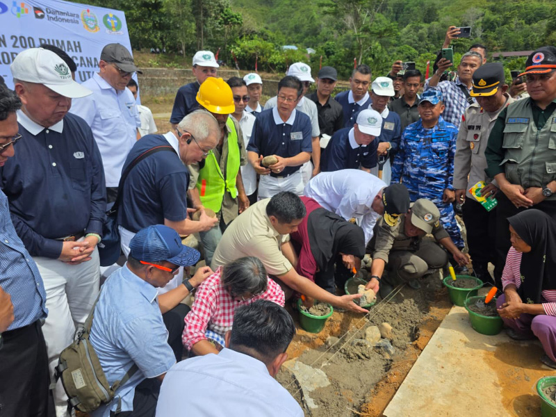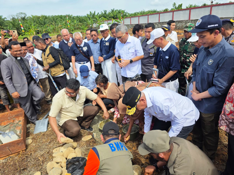 Menteri PKP Maruarar Sirait, Mendagri Tito Karnavian, Bupati Tapsel Masinton Pasaribu, dan relawan Tzu Chi Indonesia saat meletakkan batu pertama pembangunan Huntap di Kecamatan Pinangsori, Tapanuli Tengah.