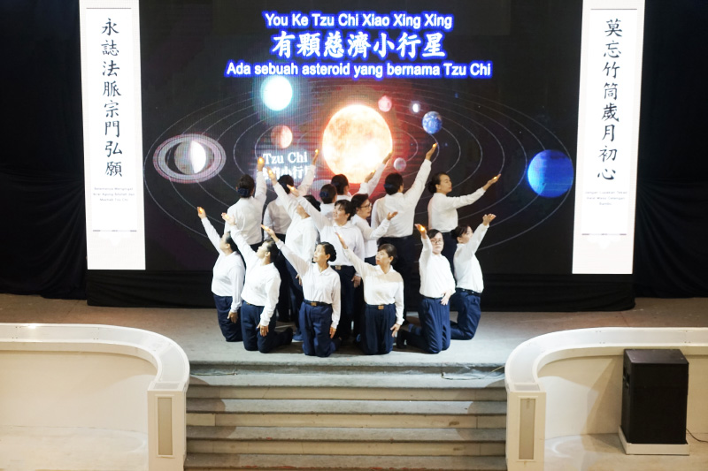 Para Bodhisatwa penyelam sutra mempraktikkan gerakan dan lagu tentang Asteroid Tzu Chi yang mencerminkan cinta kasih universal Tzu Chi tanpa batas negara.