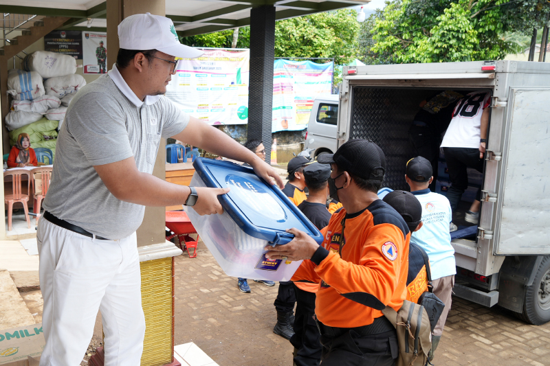 Relawan menurunkan berbagai bantuan logistik yang dibawa dari Jakarta. Bantuan ini dipersiapkan untuk memenuhi kebutuhan darurat para warga yang terdampak longsor di Desa Cibeunying.