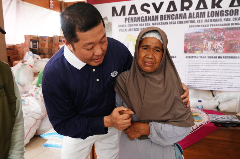 Thoe Yulius berinteraksi dengan warga yang menjadi korban tanah longsor, memberikan perhatian, penguatan, serta dorongan agar mereka tetap tabah menghadapi masa-masa sulit ini.