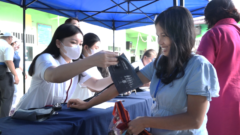 Megawati Manik sedang mengecek tensi sebelum skrining kesehatan.