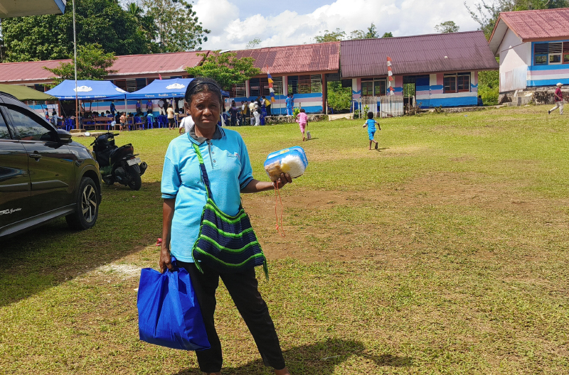 Sarah Sanadi (45), warga Desa Sepse, setelah menerima pelayanan baksos kesehatan umum, dan menerima paket sembako.