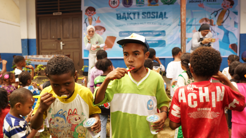 Anak-anak mempraktekan bagaimana cara menyikat gigi dengan benar setelah mendapat materi dari tim medis IDI.