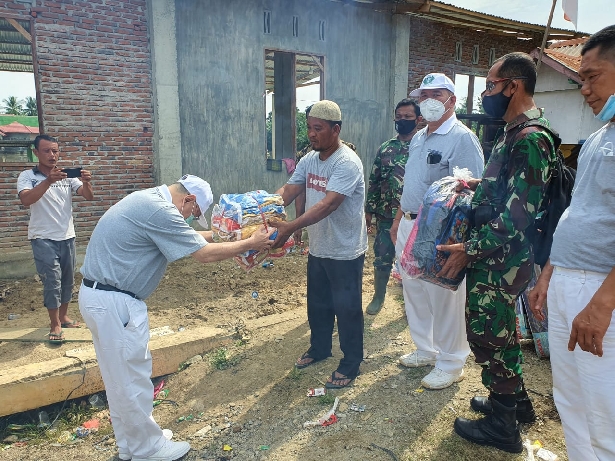 Relawan Tzu Chi di dampingi anggota TNI Kodim 0103 menyerahkan secara simbolis berupa selimut dan tikar kepada pengungsi.