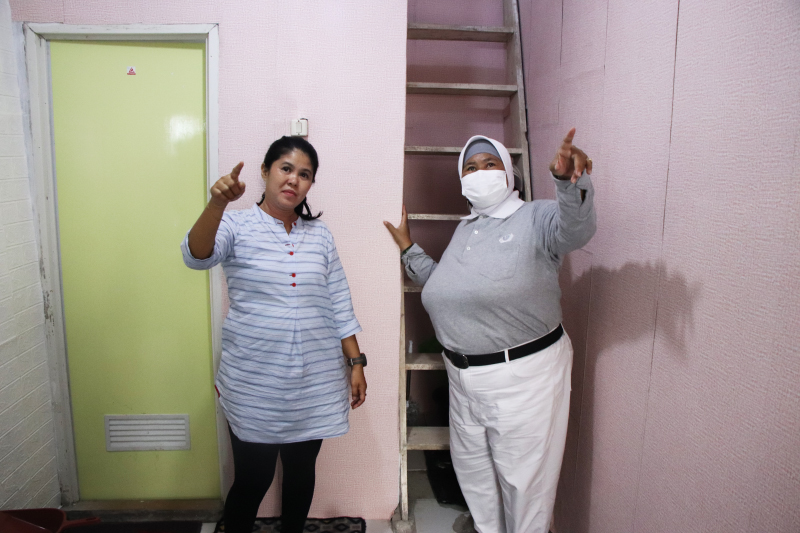 Evie Sopiantini menunjukkan sudut rumahnya yang telah direnovasi kepada relawan.