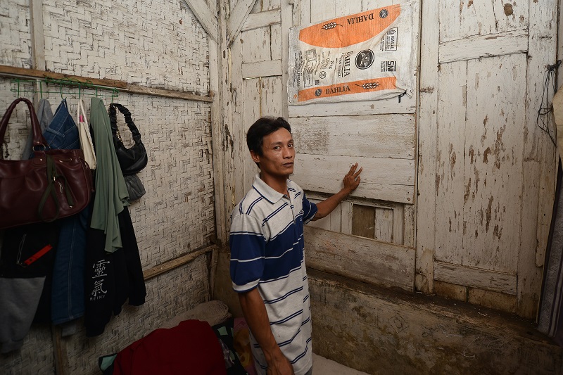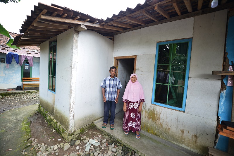 Slamet Riyadi, calon penerima bantuan renovasi rumah, menunjukkan kondisi dinding yang sudah tidak layak karena terbuat dari anyaman bambu dan papan kayu.