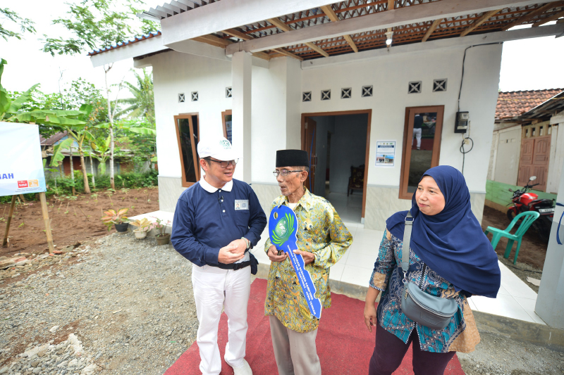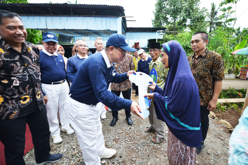 Teksan Luis, Koordinator Program Bedah Rumah Tzu Chi Indonesia menyerahkan kunci rumah secara simbolis kepada warga penerima bantuan renovasi rumah.