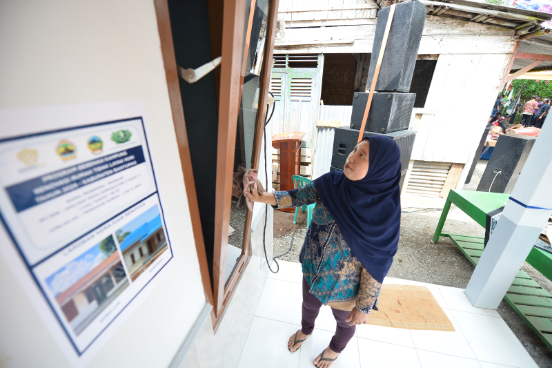 Romiati, anak perempuan Miswan, membersihkan jendela hasil renovasi rumah oleh Tzu Chi Indonesia.