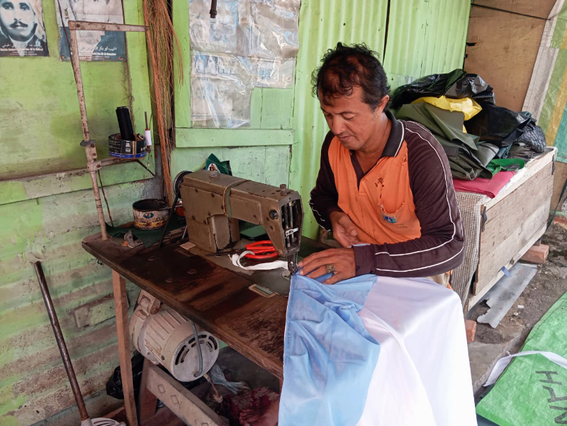 Iman Saleh yang bekerja sebagai buruh lepas, juga menjahit untuk mendapatkan tambahan pemasukan.