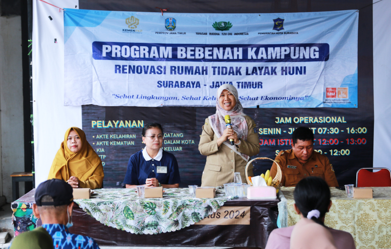 Deisy, Kepala Bidang DPRKPP Surabaya saat memberikan sambutan kepada warga calon penerima bantuan dan menghimbau untuk berdoa agar bisa menjadi penerima bantuan Program Bebenah Kampung.