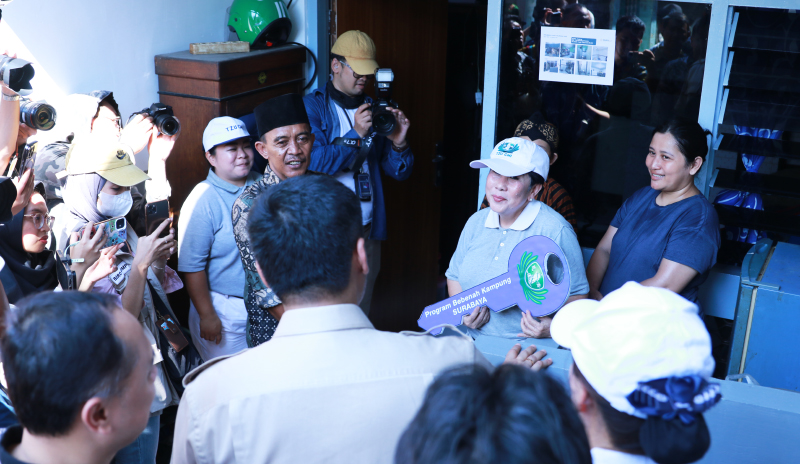 Suasana penyerahan kunci oleh Menteri PKP Maruarar Sirait dan relawan Tzu Chi Surabaya kepada Sugeng dan keluarga setelah rumahnya selesai di renovasi.