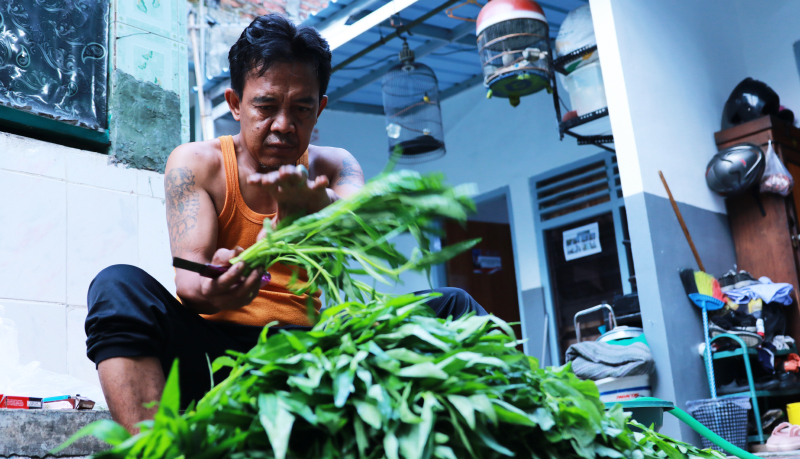 Sugeng berprofesi sebagai buruh sayur. Setiap sore, Sugeng mengolah sayur yang datang mulai dari memotong, membersihkan hingga pengemasan kemudian mengirimkannya kepada pelanggan.