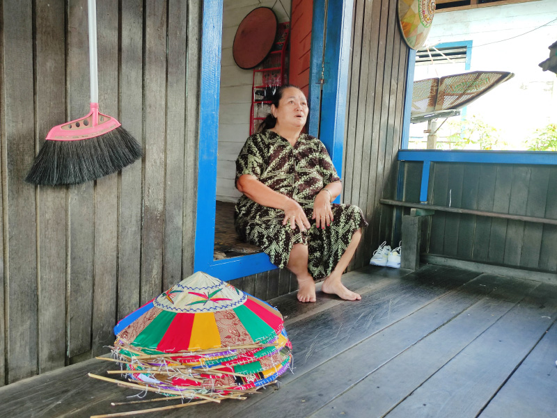 Istri Amai Meeting Udau, sehari-hari membuat kerajinan topi khas Dayak. Kerajinan topi tersebut nantinya akan dijual untuk memenuhi kehidupan sehari-hari.