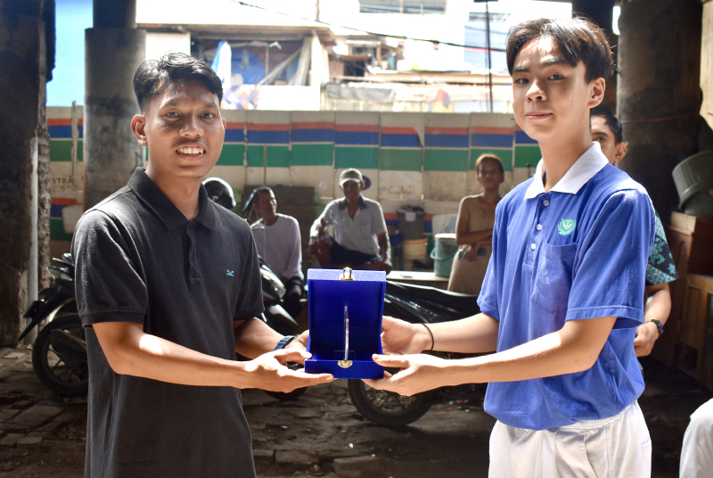Jefferson (kanan), koordinator acara Bridge of Hope, menyerahkan piagam penghargaan kepada perwakilan Sekolah Pondok Domba sebagai tanda apresiasi atas partisipasi mereka.