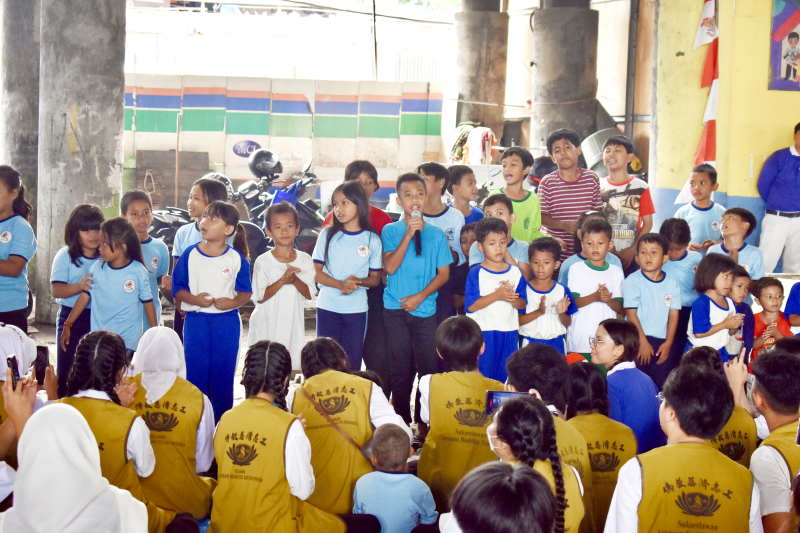 Senyum ceria mengiringi momen kebersamaan saat sekelompok Tzu Ching berfoto bersama murid-murid setelah berbagi waktu, belajar, dan bermain.
